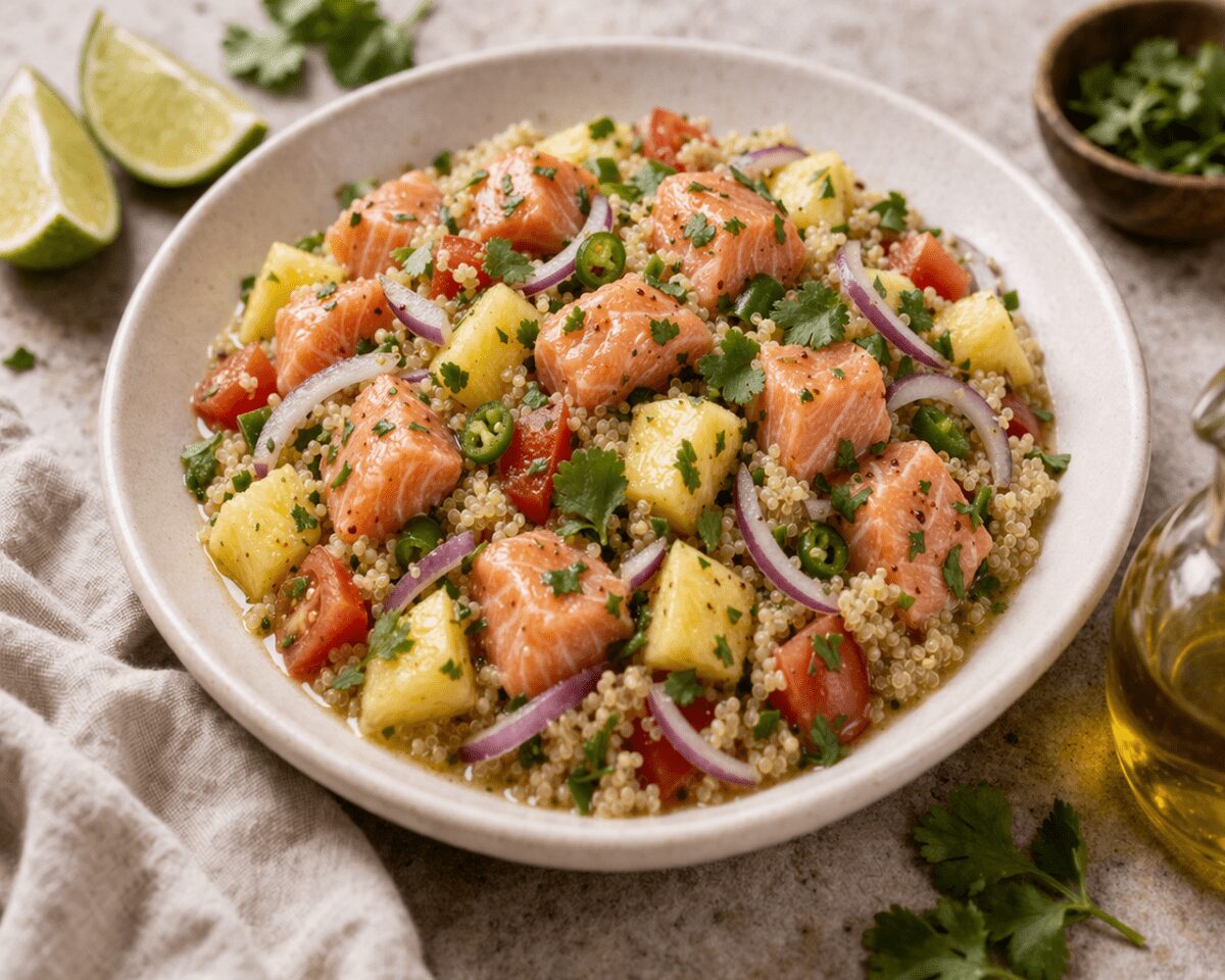 Dés de saumon frais cru, jus de citron vert, quinoa, oignons rouges, tomates, ananas, piment vert, coriandre, huile d’olive.