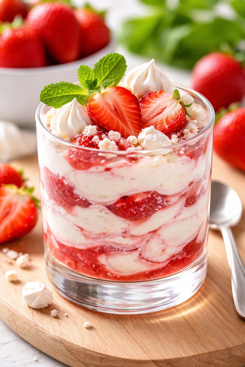Faisselle et crème montée à la vanille, fraises, éclats de meringue.