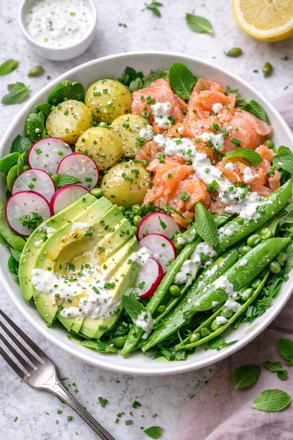 Salade verte, pommes de terre nouvelles, avocats, radis, pois gourmands, saumon fumé maison.