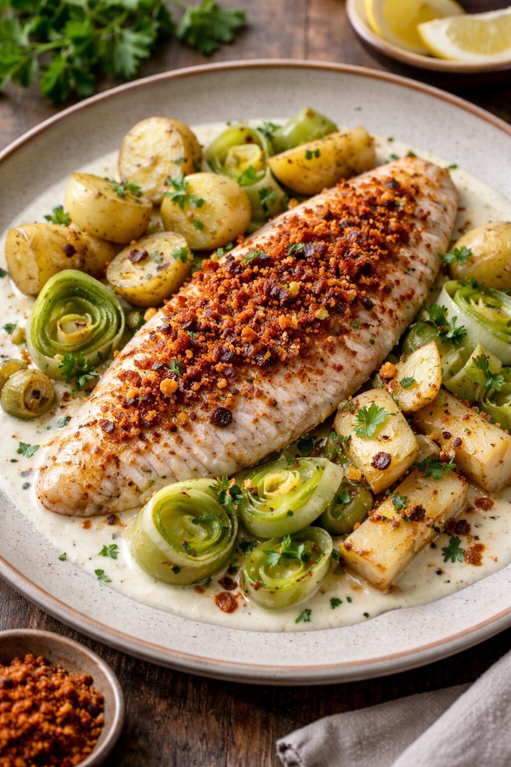 Saint Pierre cuisson vapeur, poireaux, panais et pomme de terre fondants, crème et chapelure au chorizo