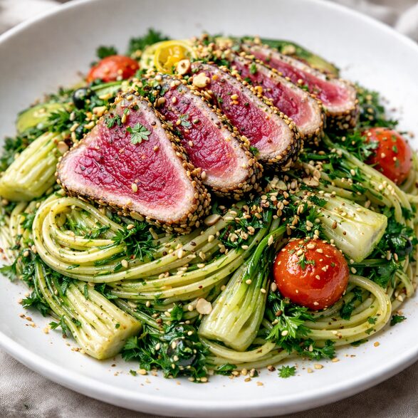 Spaghettis, pesto de persil, thon frais mi-cuit, tomates confites et chou chinois braisés, zestes de citron, graines de sésames.
